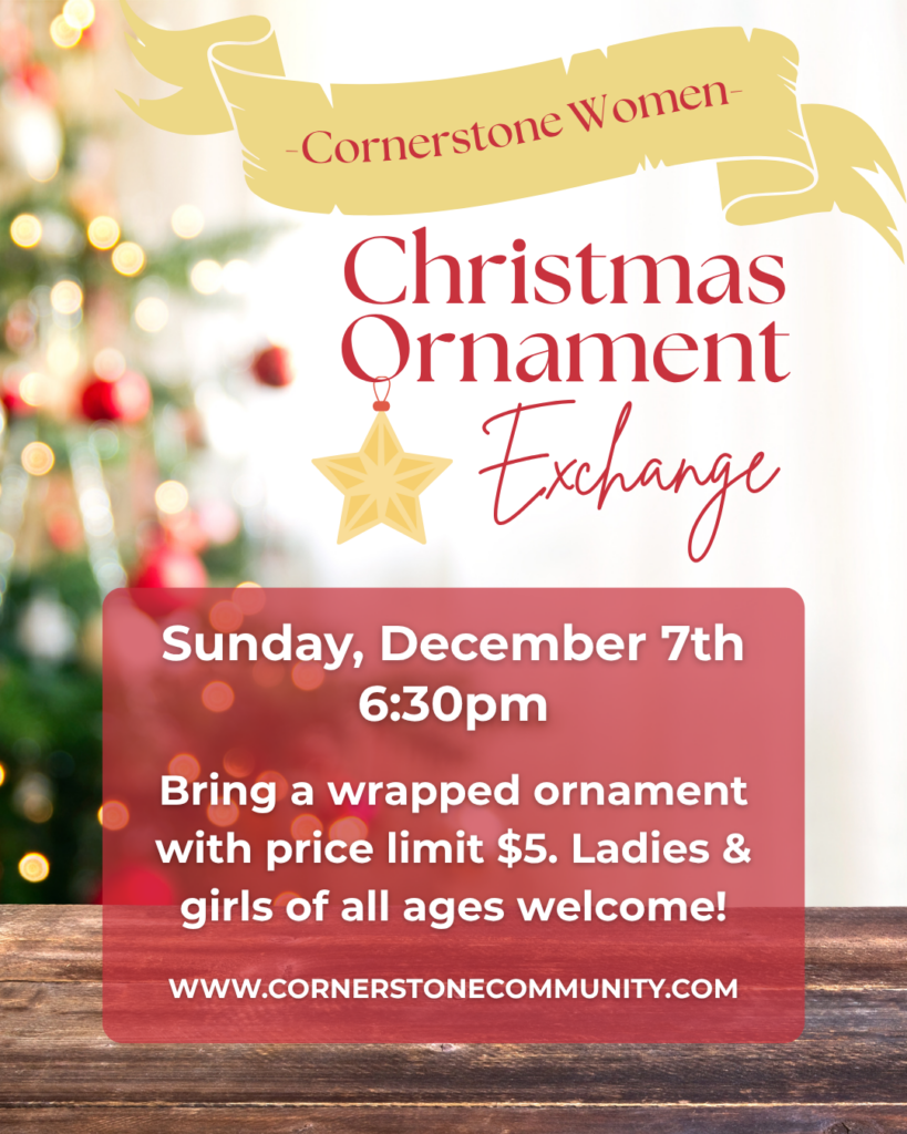 Ladies and girls of all ages, please join us on Sunday, December 7th from 6:30-8:00pm in the Kindred Oaks house for our Christmas Ornament Exchange. The Women’s Ministry will provide Christmas desserts and drinks. If you are participating in the ornament exchange, please bring a wrapped ornament with a limit of $5. We look forward to seeing you there!
